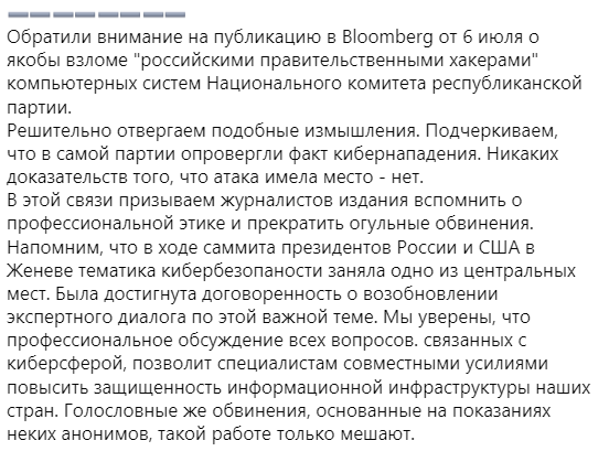 Агентство Bloomberg заявляет, что хакеры, которых подозревают в связях с российской Службой внешней разведки, взломали компьютерные сети Национального комитета Республиканской партии. В РФ отреагировали на эти обвинения и  назвали их "измышлениями".