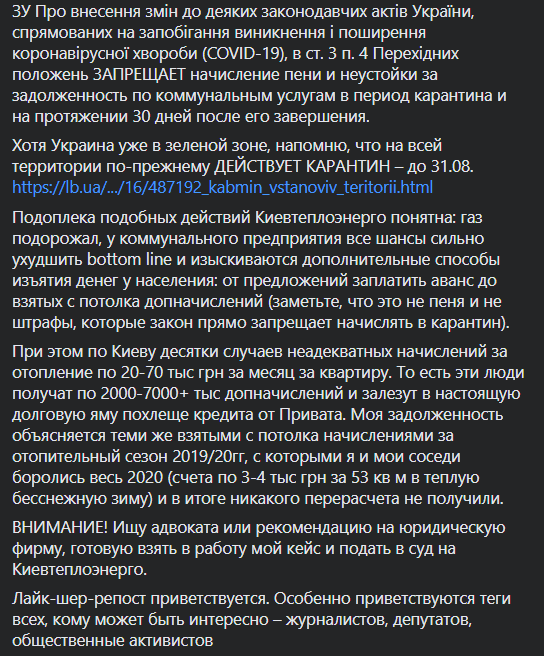 Действия Киевтеплоэнерго Инна считет незаконными, аргументируя позицию Законом Украины "Про внесення змін до деяких законодавчих актів України, спрямованих на запобігання виникнення і поширення коронавірусної хвороби", ст. 3 п.4 переходных положений которого запрещает начисление пени и неустойки за задолженность по коммунальным услугам в период карантина и на протяжении 30 дней после его завершения.