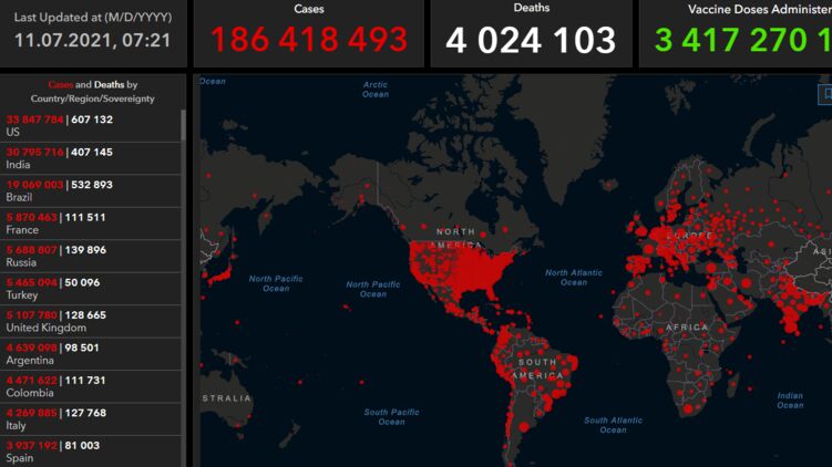 По данным на 11 июля, число зараженных на Земле перевалило за 186 миллионов, фото: arcgis.com