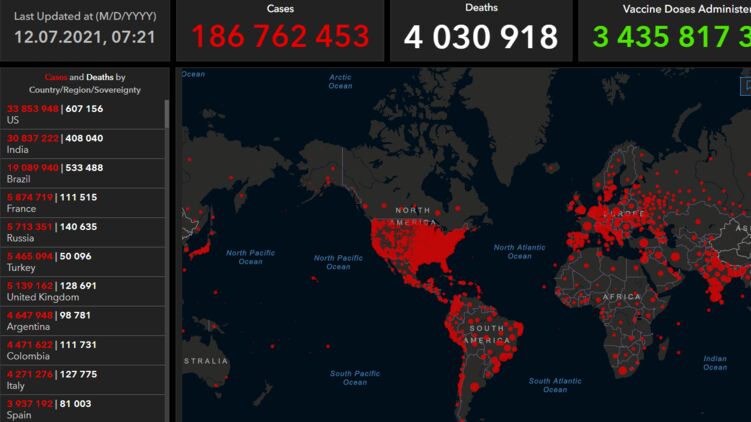 По данным на 12 июля, число зараженных на Земле приближается к 187 миллионам, фото: университет Дж. Хопкинса