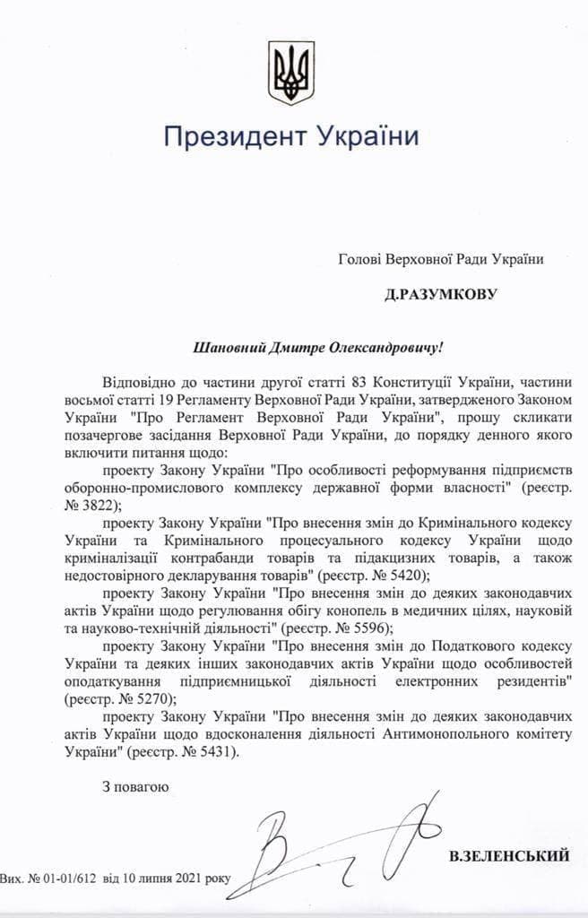 Также, помимо легализации медицинского каннабиса, в письме Верховной Рады указаны четыре проекта закона. Среди них реформирование госпредприятий оборонно-промышленного комплекса, криминализация контрабанды и недостоверного декларирования товаров, налогообложение предпринимательской деятельности электронных компаний-резидентов, а также улучшение работы Антимонопольного комитета Украины.