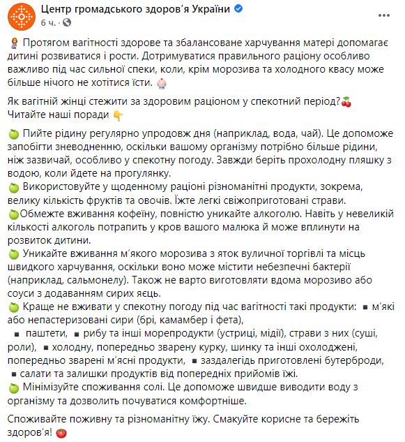 В МОЗ рассказали беременным украинкам, как правильно питаться в жаркие дни