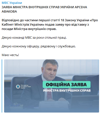 "Согласно части первой статьи 18 Закона Украины "О Кабинете Министров Украины" подал заявление об отставке с должности Министра внутренних дел. Спасибо команде МВД за годы совместной работы. Спасибо каждому офицеру, рядовому и служащему. Имею честь!", - цитирует Авакова пресс-служба МВД Украины