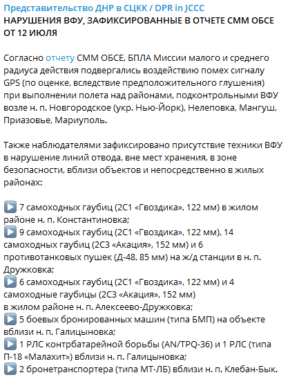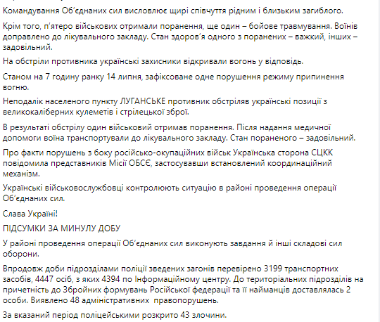 Также там добавили, что за прошедшие сутки, 13 июля, в районе проведения операции ОС зафиксировано 13 нарушений режима прекращения огня.
