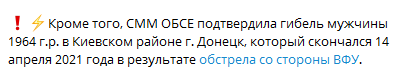 "СММ ОБСЕ подтвердила гибель мужчины 1964 г.р. в Киевском районе г. Донецк, который скончался 14 апреля 2021 года в результате обстрела со стороны ВФУ", - рассказали в "СЦКК ДНР".