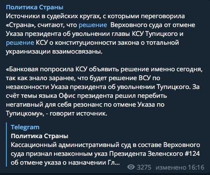 Телеграм-канал "Политика Страны" опубликовал данные своего источника. Собеседник сообщил, что сегодняшнее решение Верховного суда об отмене указа президента об увольнении главы КСУ Тупицкого и решение КСУ о конституционности закона о тотальной украинизации взаимосвязаны.