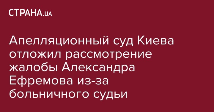 "Рассмотрение апелляционной жалобы, поданной в интересах подозреваемого А.С.Ефремова отложено до 10 октября 2016 года (14 час. 45 мин.) В связи с пребыванием судьи-докладчика Рыбака И.А. на больничном", - указано в сообщении пресс-службы Апелляционного суда Киева.