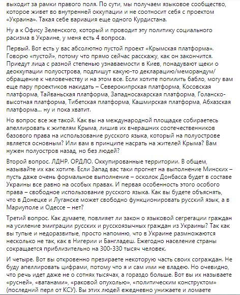 Но я верю, что окончательно судьбу Украины решат не бандеровцы, и не Зеленский — решит многонациональный народ Украины. И тем больнее после запретов и дискриминации будет и бандеровцам, и Зеленскому".