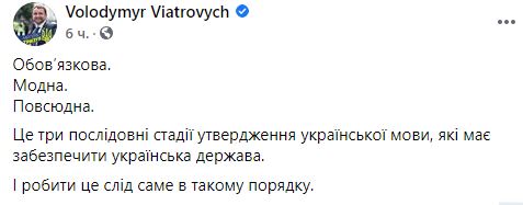 "Обязательная. Модная. Повсеместная. Это три последовательных стадии утверждения украинского языка, которые должно обеспечить украинское государство", - написал депутат "Евросолидарности" Владимир Вятрович.