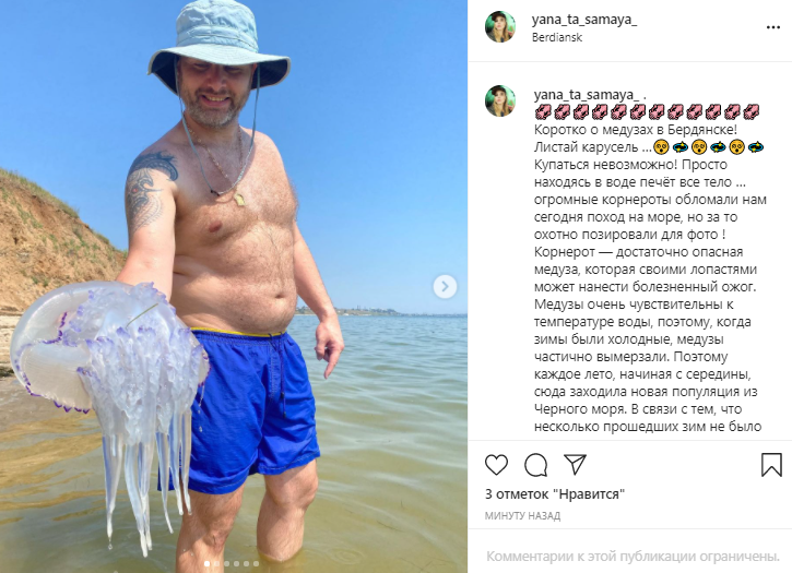 "Купаться невозможно! Просто, находясь в воде, печёт все тело... огромные корнероты обломали нам сегодня поход на море, но зато охотно позировали для фото! Корнерот - достаточно опасная медуза, которая своими лопастями может нанести болезненный ожог. Медузы очень чувствительны к температуре воды, поэтому, когда зимы были холодные, медузы частично вымерзали. Поэтому каждое лето, начиная с середины, сюда заходила новая популяция из Черного моря. В связи с тем, что несколько прошедших зим не было ледового покрова, медузы выжили и стали размножаться. Похоже им очень понравилось в Бердянске", - написала местная жительница Яна.
