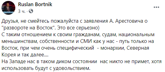 "Друзья, не смейтесь пожалуйста с заявления А. Арестовича о "развороте на Восток". Это все серьезно.