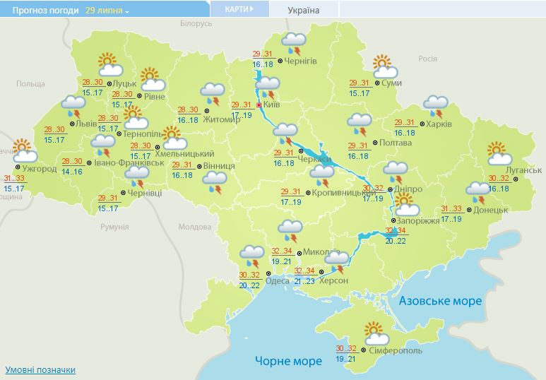На большей части Украины днем +27...+30. Преимущественно без осадков. Небольшой дождь может пройти на западе - Закарпатская область, Ровно и Луцк.