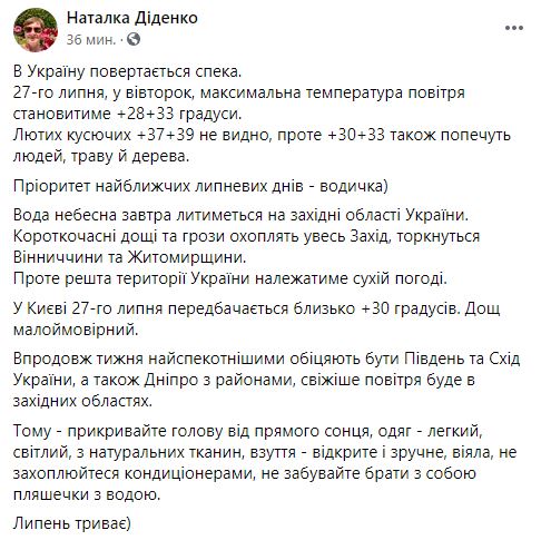 Синоптик Наталья Диденко предупредила, что в Украину возвращается жара. Температур +37...+39, как были в середине июля, пока не видно, но местами воздух прогреется до +30...+33.