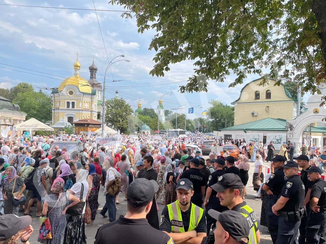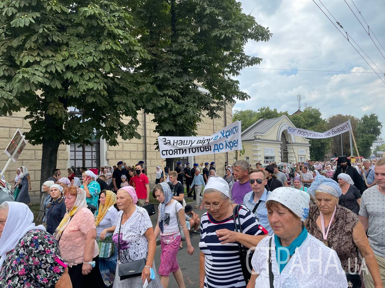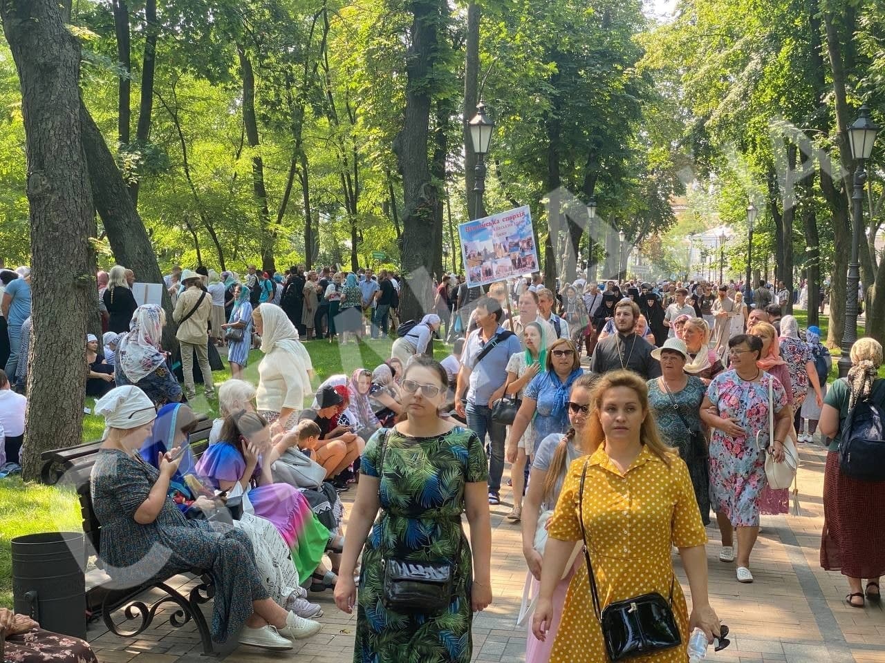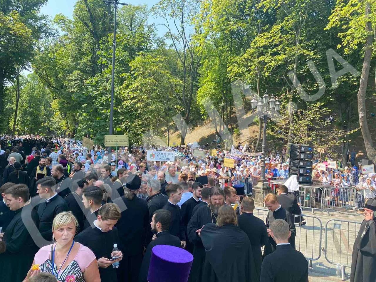 Верующие УПЦ прошли со святынями от Владимирской горки, где сперва состоялся молебен, до Киево-Печерской лавры. Вечером на площади перед Успенским собором Лавры начнется всенощное бдение.