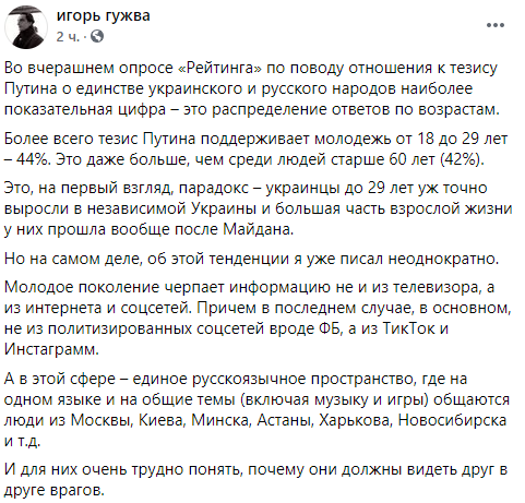 То есть разговоры о том, что 41% поддержавших тезис Путина – "малороссы", о чем уже начинают говорить в соцсетях националисты, не отвечает реальности: молодые украинцы, которые родились уже после обретения независимости и часто даже на знают, кто такие "малороссы" – под этот критерий не подпадают.