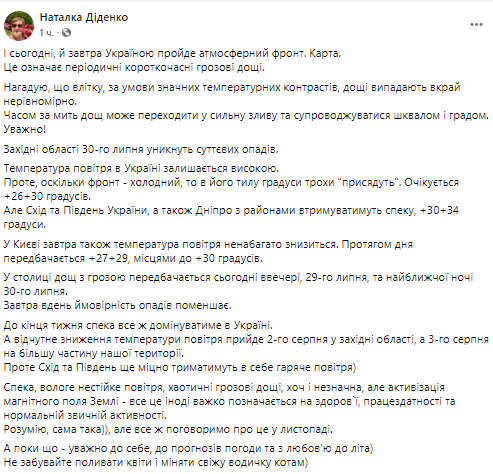 О погоде на ближайшие дни сообщила украинский синоптик Наталья Диденко в своем Фейсбуке.