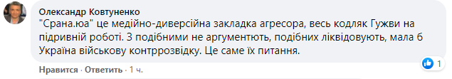 "Весь кодляк Гужвы (главного редактора "Страны" Игоря Гужвы. – Ред.) на подрывной работе. С подобными не аргументируют, подобных ликвидируют, если бы в Украине была военная контрразведка. Это именно их вопросы", – написал Ковтуненко.