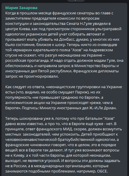 Официальный представитель МИД РФ Мария Захарова прокомментировала ответ главы МИДа Франции на запрос сенаторов о ситуации с ультраправыми в Украине.