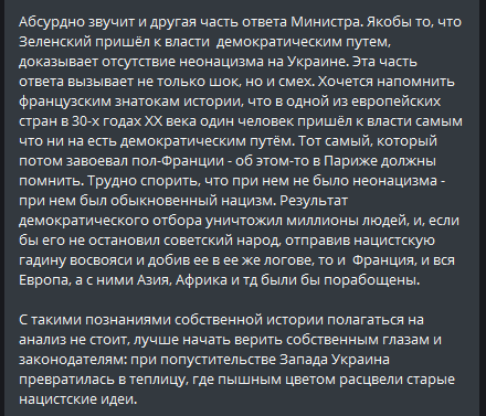 Также она прокомментировала слова Жана-Ив Ле Дриана, что демократический приход к власти Зеленского доказывает отсутствие неонацизма в стране.
