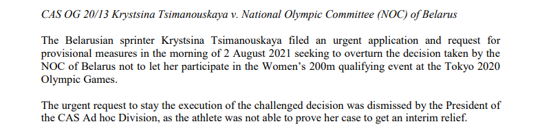 Там говорится, что Тимановская подала срочную заявку в суд с просьбой включить ее в число участников квалификационных забегов среди женщин на 200 метров в Токио-2020, где она и должна была соревноваться.