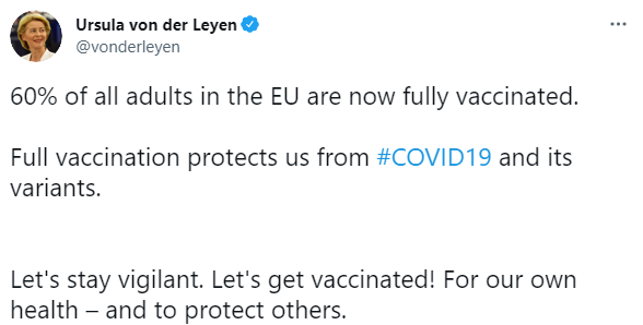 "60% всех взрослых в ЕС в настоящее время полностью вакцинированы. Полная вакцинация защищает нас от Covid-19 и его вариантов", - пишет глава Еврокомиссии в социальной сети.