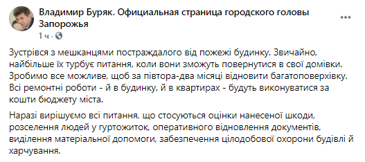 "Сейчас решаем все вопросы, касающиеся оценки нанесенного ущерба, расселение людей в общежитие, оперативного восстановления документов, выделения материальной помощи, обеспечения круглосуточной охраны здания и питания", - добавил мэр Запорожья.