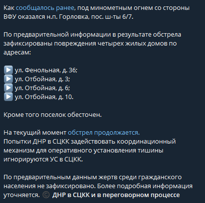 Как заявили в Телеграм-канале "Представительства ДНР в СЦКК и в переговорном процессе: оперативного мониторинга и информирования о ситуации с безопасностью", ВСУ обстреляли город Горловка.