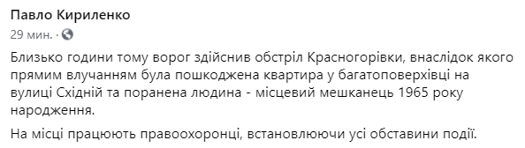 По словам губернатора, обстрел произошел около 8:00 утра на улице Восточной. В результате прямого попадания, как добавил Кириленко, была повреждена квартира в многоэтажном жилом доме.