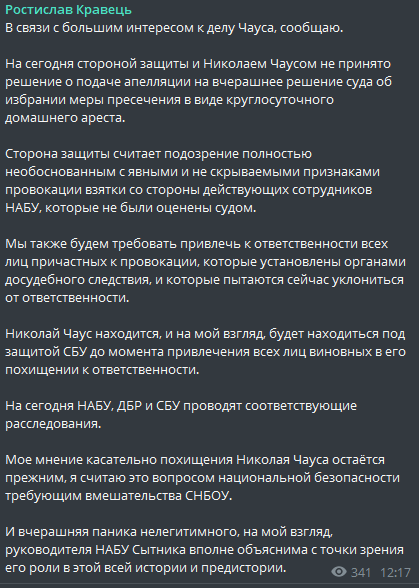 Адвокат судьи Николая Чауса Ростислав Кравец сообщил, что защита не приняла решение об апелляции на вчерашнее судебное решение об избрании меры пресечения в виде круглосуточного домашнего ареста. Адвокат также сообщил, что в подозрении НАБУ он видит "нескрываемые признаки" провокации.
