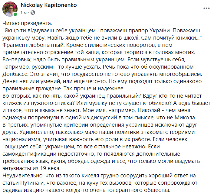 Политолог Николай Капитоненко пишет, что Зеленский выдвинул сомнительный тезис о том, что надо быть "правильным" украинцем.