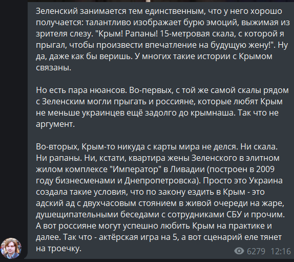 "Зеленский занимается тем единственным, что у него хорошо получается: талантливо изображает бурю эмоций, выжимая из зрителя слезу. "Крым! Рапаны! 15-метровая скала, с которой я прыгал, чтобы произвести впечатление на будущую жену!". Ну да, даже как бы веришь. У многих такие истории с Крымом связаны.