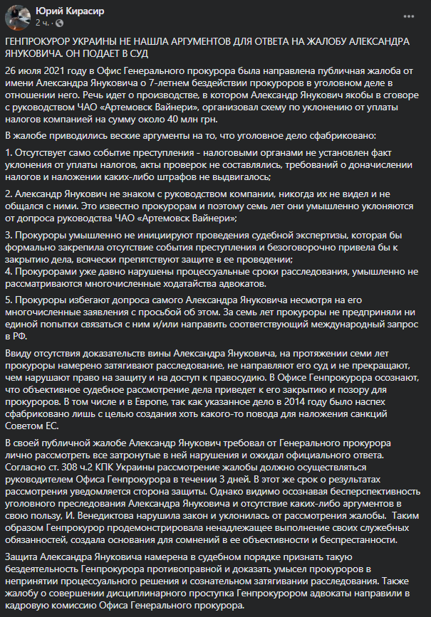Кирасир напомнил, что 26 июля 2021 году в Офис Генерального прокурора была направлена публичная жалоба от имени Александра Януковича о 7-летнем бездействии прокуроров в уголовном деле в отношении него.