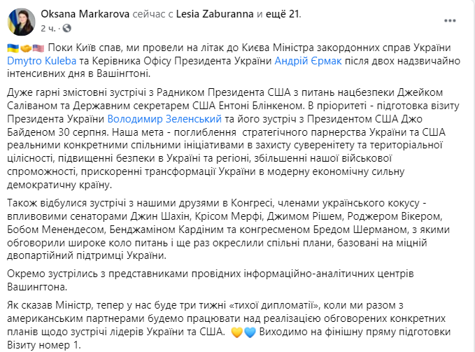 Посол Украины в США рассказала, что Ермак, она и Кулеба провели "очень хорошие содержательные встречи" с советником американского президента по национальной безопасности Джейкобом Салливаном и с главой Госдепа Энтони Блинкеном и сенаторами.