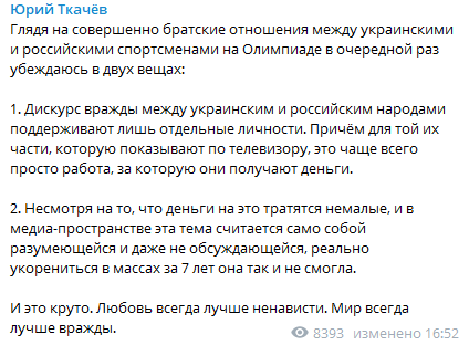 "Глядя на совершенно братские отношения между украинскими и российскими спортсменами на Олимпиаде в очередной раз убеждаюсь в двух вещах: