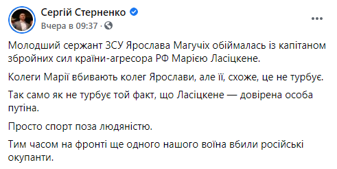 "Младший сержант ВСУ Ярослава Магучих обнималась с капитаном вооруженных сил страны-агрессора РФ Марией Ласицкене.