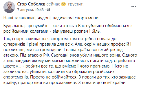 Экс-нардеп от "Самопомощи" Егор Соболев написал, что "чувствует отчаяние и боль" всякий раз, когда украинский спортсмен обнимается с российским.