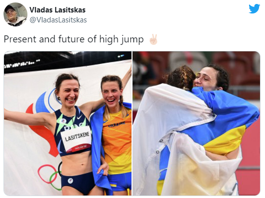 На Олимпиаде в Токио украинская легкоатлетка Ярослава Магучих, завоевавшая для Украины бронзовую медаль по прыжкам в высоту, сделала дружеское фото с чемпионкой из России Марией Ласицкене (занявшей 1 место).