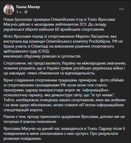 При этом Маляр утверждала, что неосторожное поведение спортсменов может становиться объектом "информационных спецопераций врага".