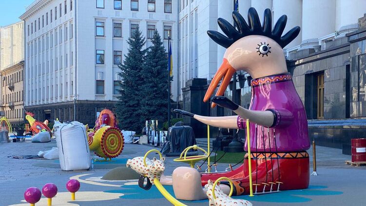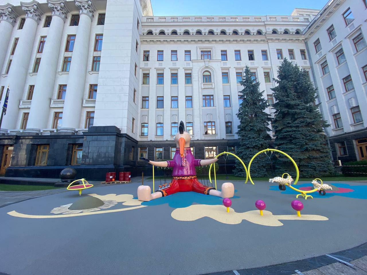 Перед Офисом президента сегодня закончили монтаж игровой площадки с каруселями и качелями. Арт-локацию, созданную по мотивам полотен украинской художницы Марии Примаченко, откроют ко Дню независимости. Она будет бесплатной для всех посетителей.