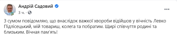 Также градоначальник выразил соболезнования родным и близким Лева Пидлисецкого и добавил, что политик был его другом, коллегой и побратимом.