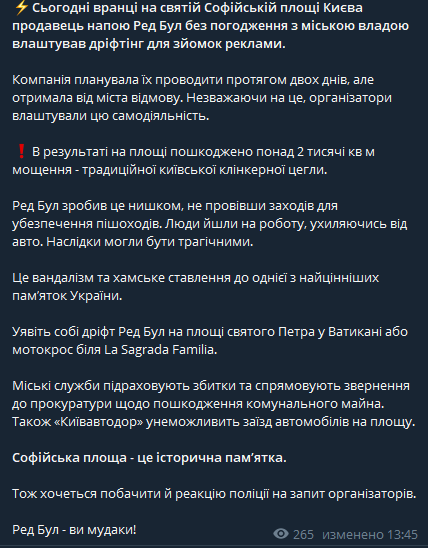 "Это не просто недопустимый акт вандализма, это хамское отношение к киевлянам и к одной из наиболее ценных святынь Украины - Софии Киевской (...) "Ред Бул" - вы муд@ки", - написал он.