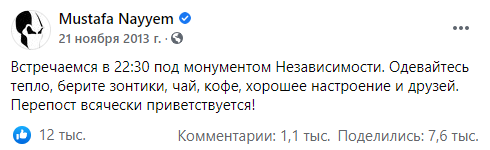 Майдан начался 21 ноября 2013 года с поста журналиста Мустафы Найема в Facebook, который призвал собраться в 22:30 под монументом Независимости, прихватив с собой теплую одежду, зонтики, чай или кофе, а также "хорошее настроение и друзей".