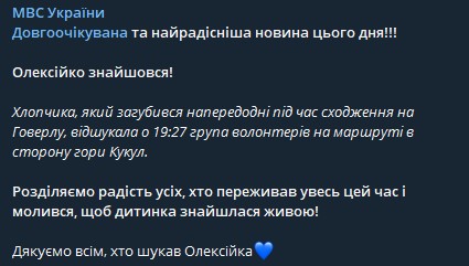 Там рассказали, что ребенок, который потерялся в субботу на Говерле был найден сегодня в 19:27. Его нашли волонтеры на маршруте в сторону горы Кукул.