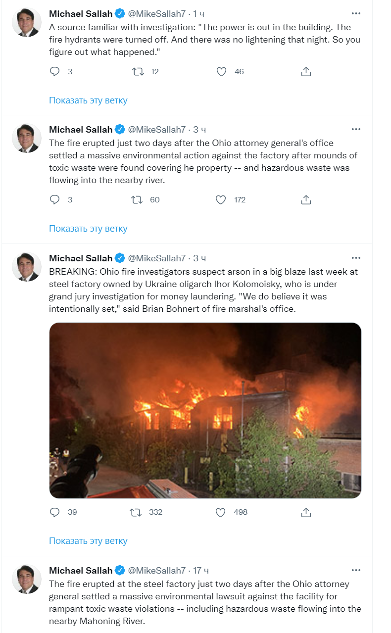 На прошлой неделе на сталелитейном заводе в штате Огайо, принадлежащем олигарху Игорю Коломойскому, произошел масштабный пожар. Следователи полагают, что причиной пожара стал поджог.