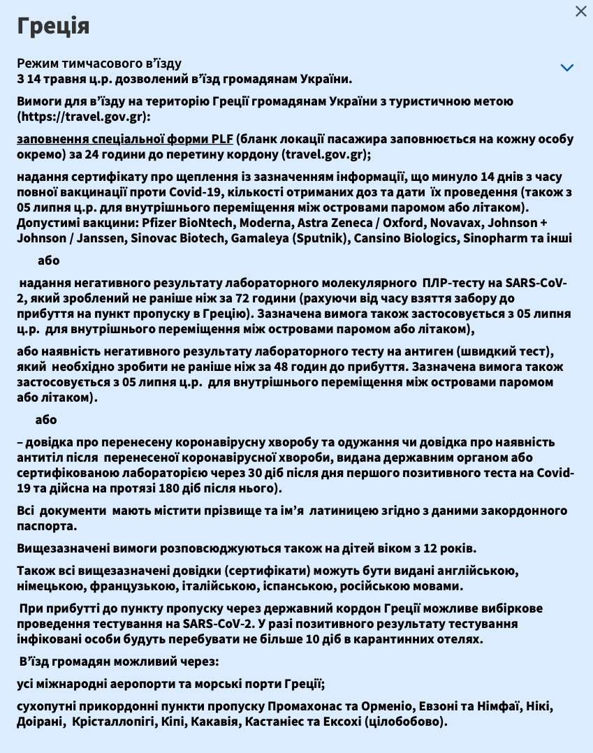 Греция запрашивает на границе у украинцев или сертификат о вакцинации, или отрицательный тест на ковид. За сутки до посещения страны нужно оставить заявку на сайте греческого ведомства.