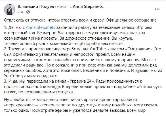 "Да, мы с Anna Stepanets закончили работу на телеканале "Наш". Это был интересный год. Безмерно благодарны всему коллективу телеканала за совместные яркие проекты. За дружеское отношение. Вы крутые. И да, мы переходим на канал "Украина 24". Рады присоединиться к профессиональной команде. Впереди новые проекты - подробнее об этом чуть позже, по возвращении из отпуска", - написал Полуев.