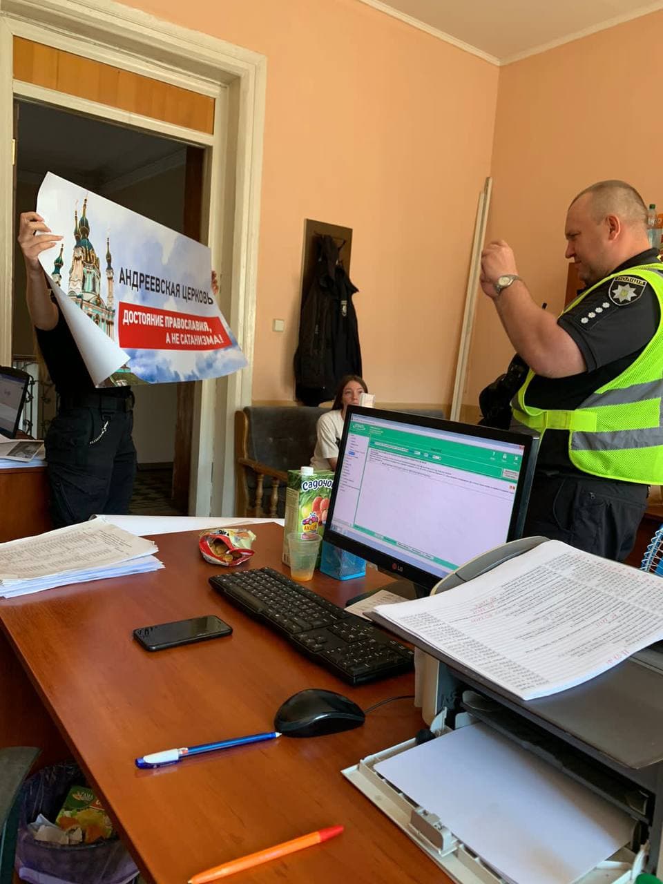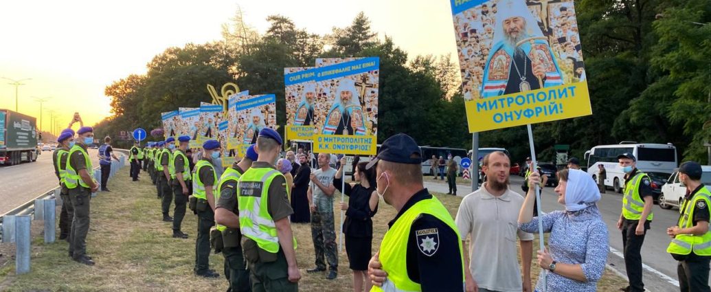 11:57  Полиция начала забирать у верующих плакаты, на которых Варфоломея обвиняют в захвате храмов.