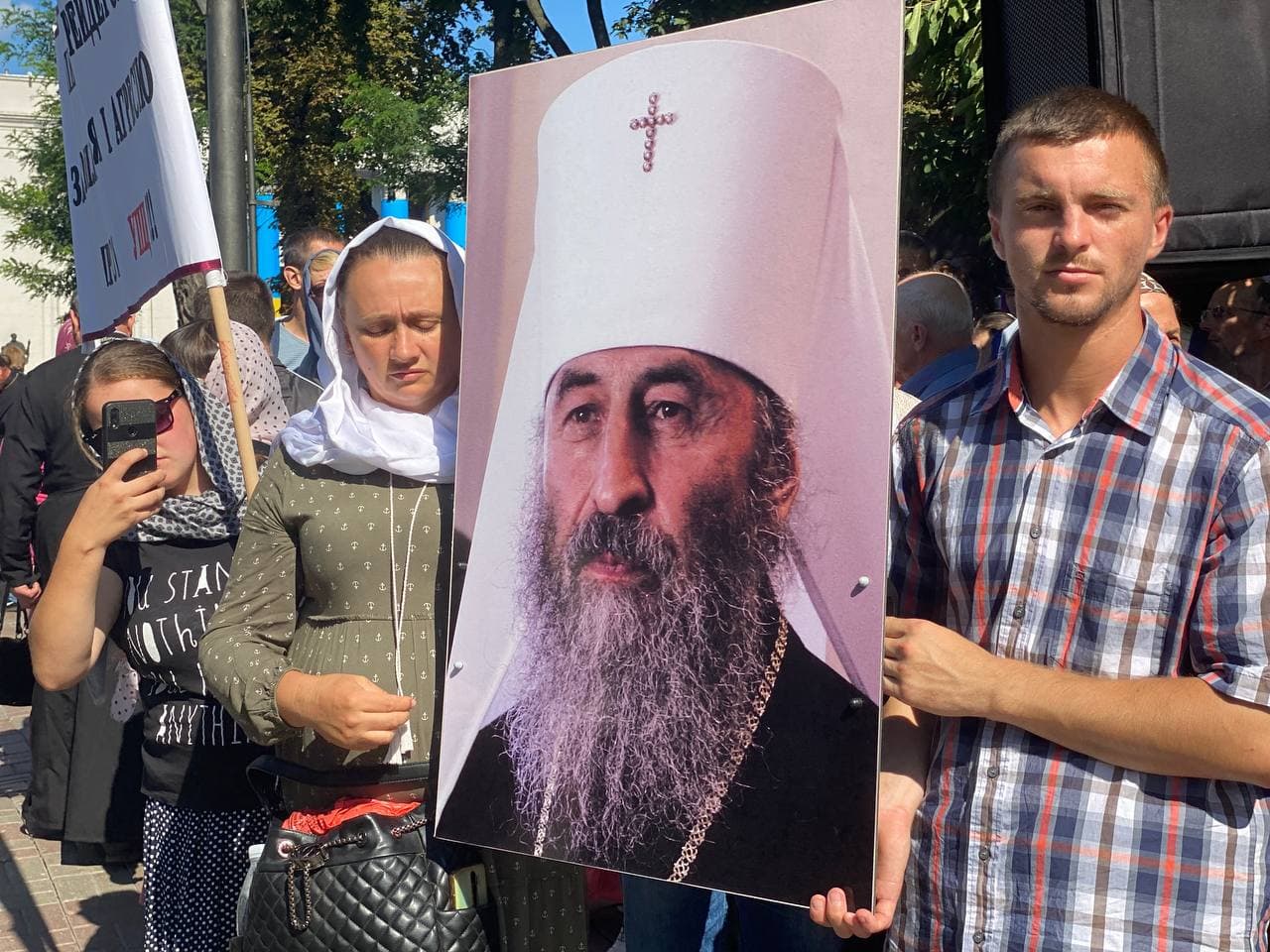 11:07  Верующие держат портреты митрополита Онуфрия - главы УПЦ.