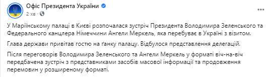 После переговоров Владимира Зеленского и Ангелы Меркель в формате один на один предусмотрена встреча с представителями средств массовой информации и продолжение переговоров в расширенном формате.