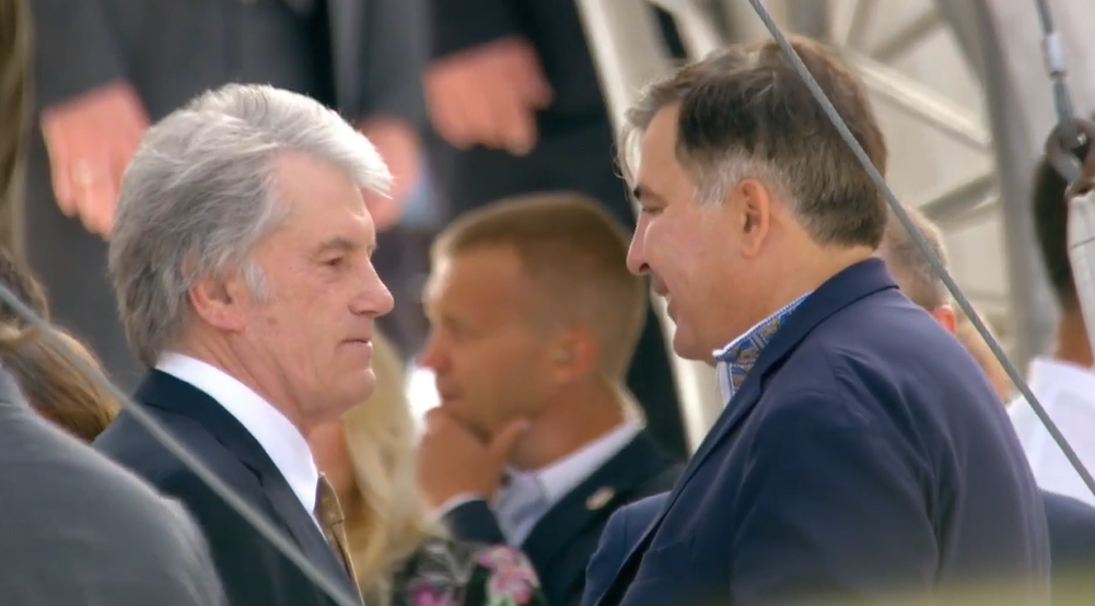 09:55 Ющенко мило общается с Саакашвили. Они одновременно были президентами.